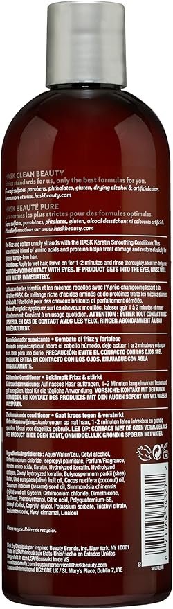 Transform your hair care routine with HASK Keratin Smoothing Conditioner, designed for all hair types. This 355mL liquid conditioner is color-safe and free from sulfates, parabens, phthalates, and gluten, ensuring a gentle yet effective treatment for your locks.