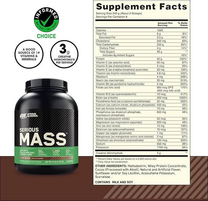Elevate your fitness journey with Optimum Nutrition Serious Mass Protein Powder in a delicious chocolate flavour. This high-calorie mass gainer is expertly formulated to help you pack on muscle and fuel your workouts effectively!